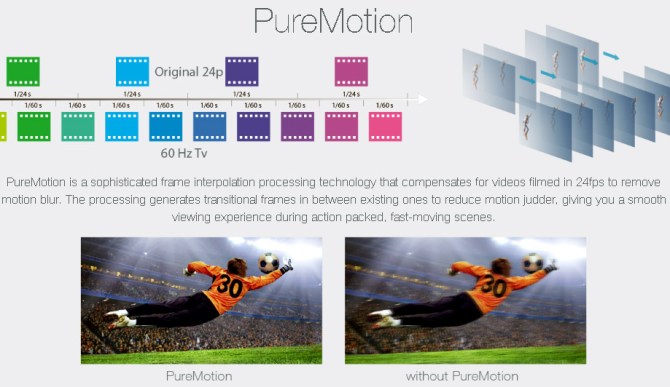 PureMotion of sophisticated frame-interpolation technology, advanced motion control processing eliminates motion blurring or image judder, even in high-speed action sequences. PureMotion works in 2D and is optimized for 1080p24.