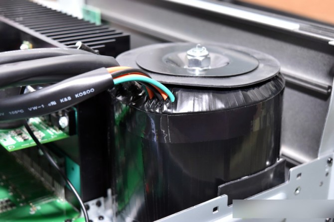 Current comes in and passes through the power supply board which is connected to the custom toroidal transformer by Noratel, that is as thick as the chassis height.