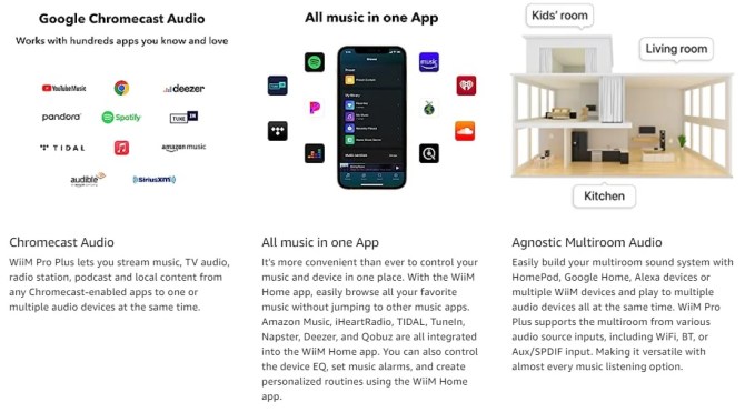 - Seamless multiroom streaming via AirPlay 2, Chromecast, Alexa or other WiiM devices.