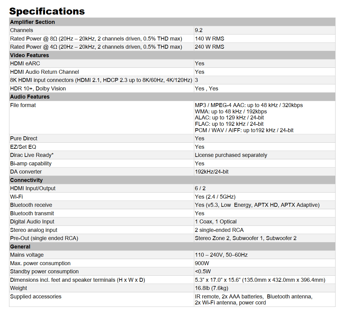 - Dolby Atmos, DTS:X decoding, supports up to 9.2, 5.2.4 configurations