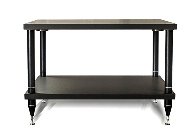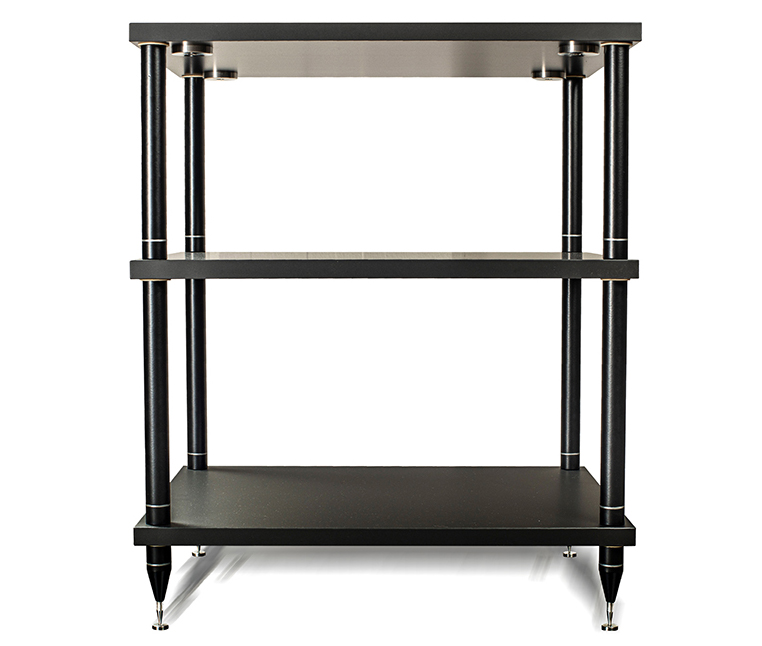 High-quality audio structure with HDF shelves and black-coated solid steel, equipped with rubber washers for decoupling and a load capacity of 40kg per shelf.
