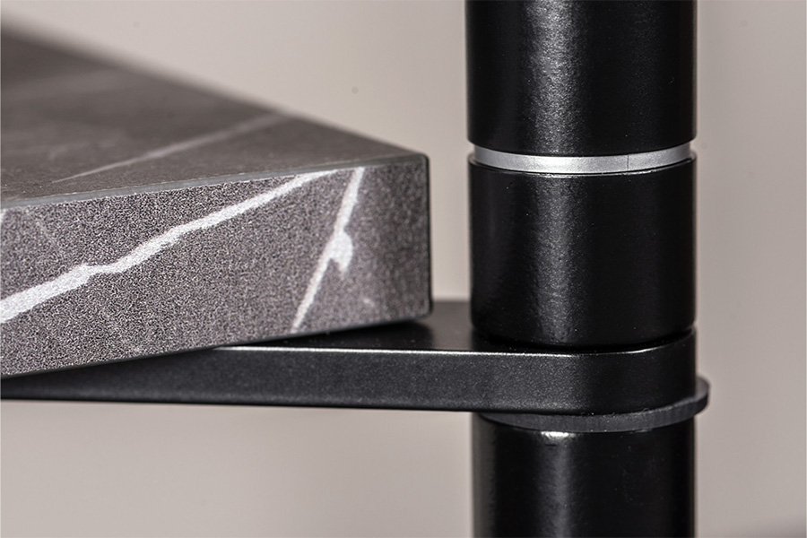 High-quality, sophisticated audio structure with HDF shelves with a stone-like finish, and solid steel external structure connected to the shelves via steel brackets, equipped with rubber washers for decoupling and a load capacity of 45kg per shelf.